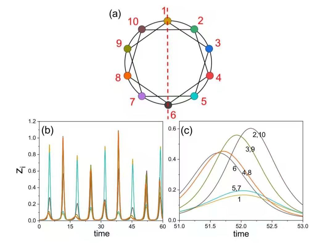 在最近发表于《国家科学评论》(National Science Review, NSR)的一篇研究论文中,研究者对前文中描述的这个系统进行了数值模拟和理论分析。结果发现,在所有10个群落达到整体相位同步之外,还存在更细致的同步模式。比如,在上图中,以1、6两个群落之间的红色虚线为对称,相互对称的4组群落(2和10、3和9、4和8、5和7)不只是振荡相位同步,而且振荡的振幅也相同(如上图c所示)。作者将这种整体相位同步中的振幅同步称为“同步中的同步”。比较有趣的一点是,在这样的对称模式下,空间上距离较远的两个群落,比如3和9,也可以实现“同步中的同步”。