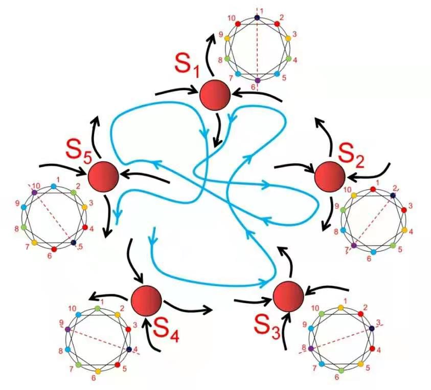 而且,这样的对称和同步模式(形成“集团同步”或“同步斑图”)不止一个,以5-10、4-9、3-8、2-7连线为对称轴都可以形成对称模式,从而构成不同的同步斑图。事实上,研究者利用理论计算和分析,可以预测出所有可能出现的集团同步态,并解析得到集团同步的稳定性条件。