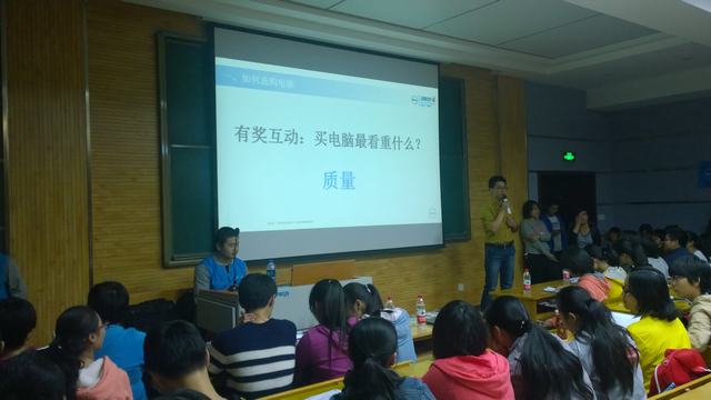 活动中,刘海涛为在场学生讲述了各种类型电脑的优缺点,教授同学们挑选电脑的技巧及升级电脑配置的方法。随后,他向在场同学介绍了电脑行业的发展历史以及戴尔企业文化。此外,他还通过讲述大学生职业生涯规划以及其他成功的大学生活与毕业后的发展,向大家传授了如何度过大学生活的经验。讲座最后,现场观众参与了抢答环节,整场讲座的气氛达到了高潮。