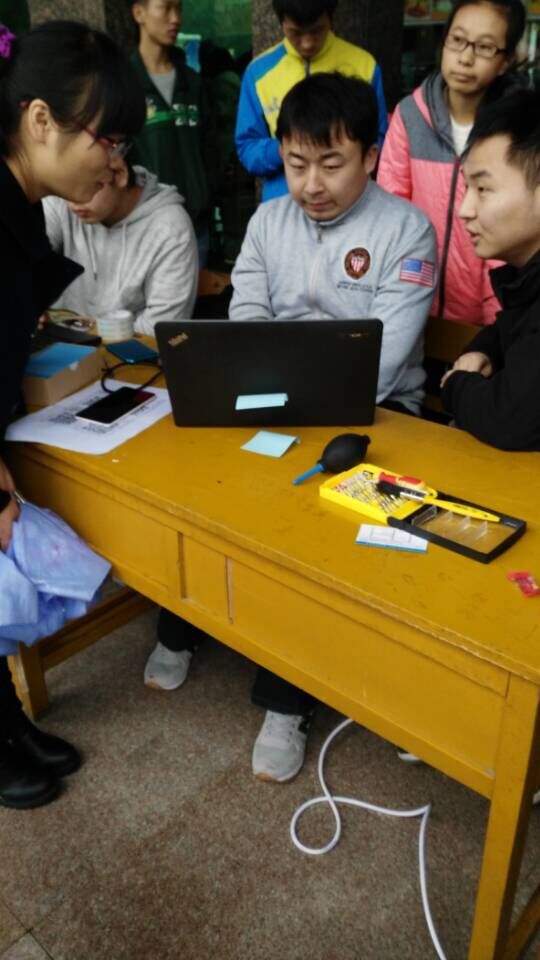 为提高社团成员实践能力,以自身特长服务学校师生,公海5500线路检测电子协会于2015年11月7日在雁塔校区喷泉广场举办了一场以“电脑义诊,温暖校园”为主题的电脑义务维修活动。社团特邀嘉宾神州数码工程师姚明升,戴尔课戴表陕西区校园专员侯帅进行维修指导,全体社团成员参与了本次活动。