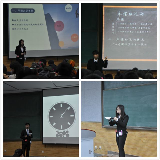 接下来进入本次活动的主要环节。由十位选手依次登台展示自己的教学技能。比赛分为两个环节,首先是即兴演讲环节,选手随机抽得一题,在3分钟的现场准备之后进行演讲。为增加大家对选手的了解,在选手准备时间中,为现场观众播放选手的VCR。即兴演讲结束后,选手为大家带来了精彩纷呈的七分钟多媒体讲课。十位选手各有所长,教态大方、教学设计新颖、授课过程规范,体现了扎实的学习和准备过程,也展现了较高的教学素养和水平。特别是,选手陈露的“覆杯实验”不仅让同学印象深刻,而且受到了评委老师的赞扬。选手朱凯旋在引课、自制教具和归纳总结等方面表现突出。