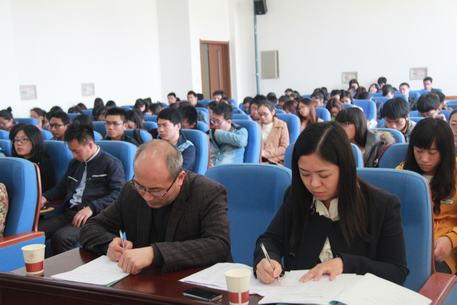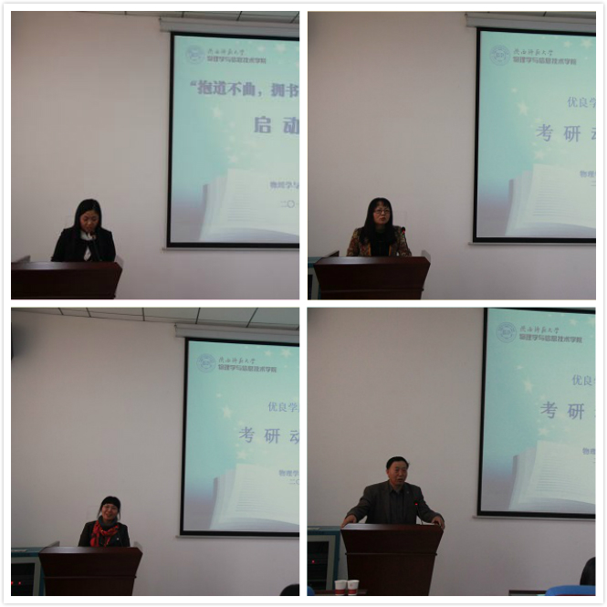 2015年4月9日下午,我院于致知楼3623教室召开学风建设活动启动仪式暨考研动员大会,学院院长屈世显教授,学院各学科8名负责教授,院团委书记杨仁财老师参加了动员会。会议由学院党委副书记曹宇巍老师主持,2012级全体非师范生参加了此次会议。