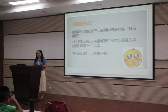 讲座中,曹宇巍以“大学生礼仪素养——魅力从这里开始”为主题展开,分别从“什么是礼仪、学习礼仪的作用、大学生基本礼仪规范”三个方面来讲述大学生学习礼仪的重要性和必要性。首先,她向全体学生讲授了礼仪的本质,并强调作为一名大学生骨干,应该对礼仪素养有一定的了解,在正式场合中践行礼仪,做一名“懂礼仪,行礼仪”的当代有为青年人。紧接着,她向学生论述学习礼仪的重要性。她讲到,学习好礼仪,不仅可以改善个人的沟通水平,还可以提高个人的素质,维护好个人的形象。最后,她通过具体的事例和形象生动的图片,系统地向大家阐述大学生基本礼仪规范,希望大家学会正确的礼仪,养成良好的礼仪素养,为面试和将来的工作生活打好基础。