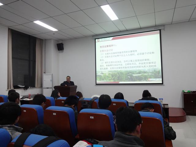 11月20日晚7点,我院第二十五期党课培训第三讲于致知楼六层会议室举行。旅游与环境学院分党委副书记郝高建主讲,全体入党积极分子参加讲座。讲座由2012级非师范本科生辅导员仵鹏浩主持。
