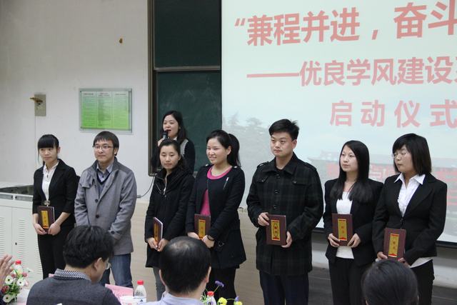 2011级本科生辅导员周静为大家介绍我院“兼程并进,奋斗在路上”---优良学风建设系列活动方案。本次系列活动,共分为11个子项目。项目时空交织,以宿舍建设为抓手,以特色活动为载体,计划通过举办恳谈会、动员会、设立党员示范监督岗和结成“一对一”学习组等形式,帮助受警示同学在学习的道路上兼程并进,奋起直追,同时也督促全院本科生养成“厚德、积学、励志、敦行”的良好品质。随后,各位领导老师为参加本次学风建设活动并担任本科生各个班级“班主任”的研究生颁发了聘书,为学院党员、干部颁发了工作日志本。
