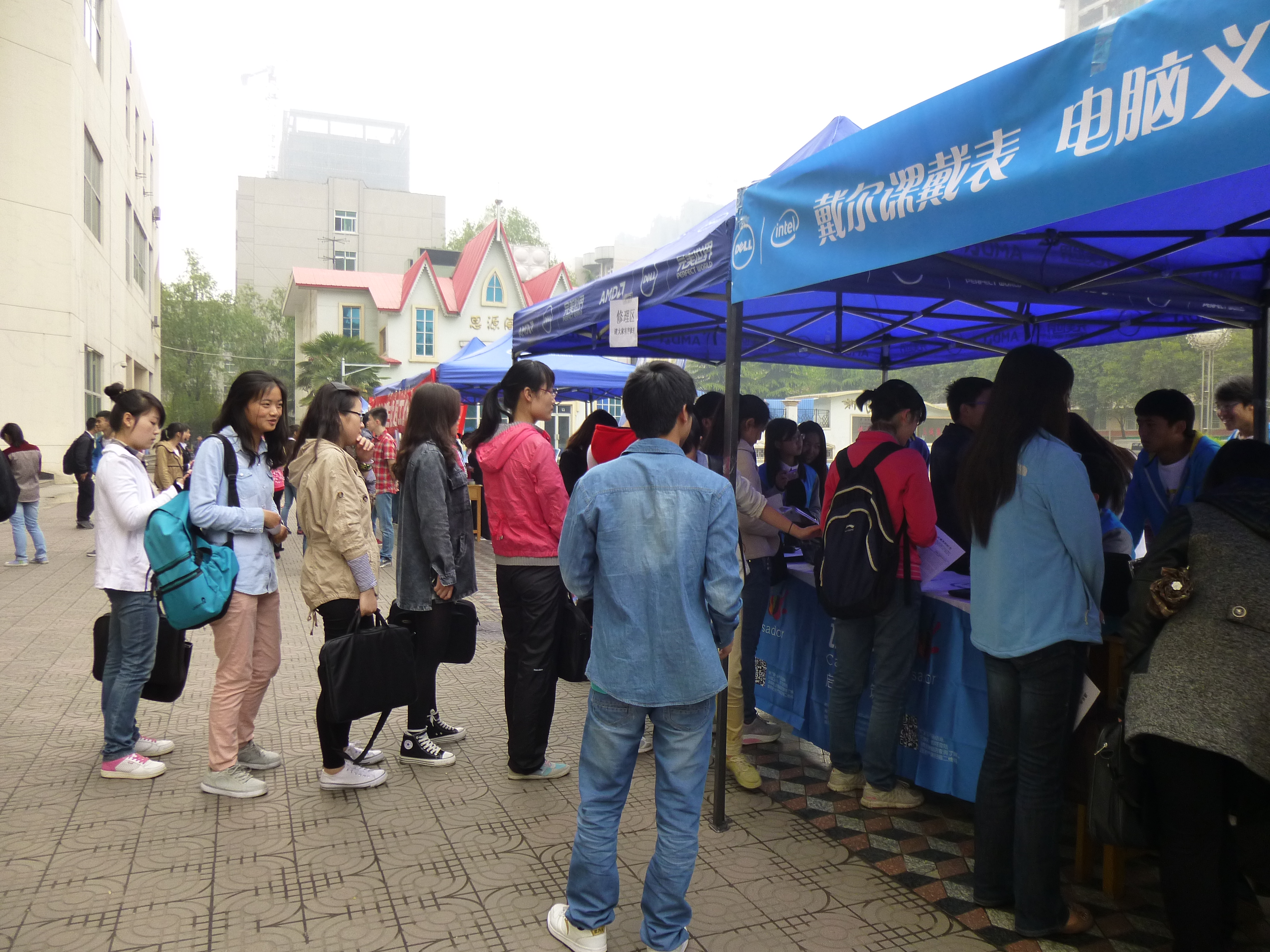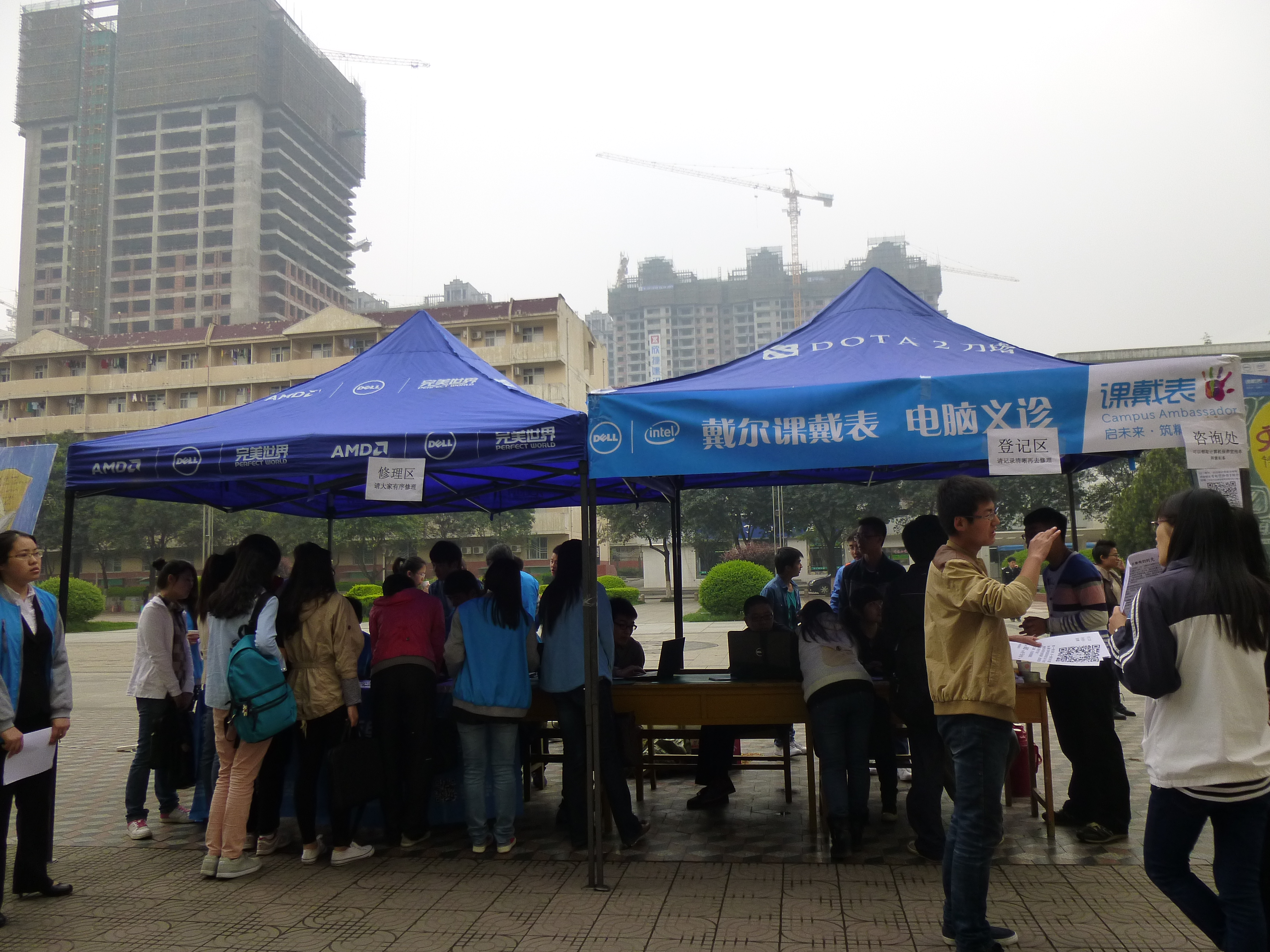 在清凉舒爽的春季,伴着柔柔的暖风,我院电子协会电脑义务维修活动在陕师大雁塔校区喷泉广场上火热展开。此次活动在4月12、13日午间进行,邀请了著名的戴尔电脑公司的专业工程师李伟强、郭林林现场坐镇,帮助同学们解决计算机的难题。现场场面火爆,秩序井然。