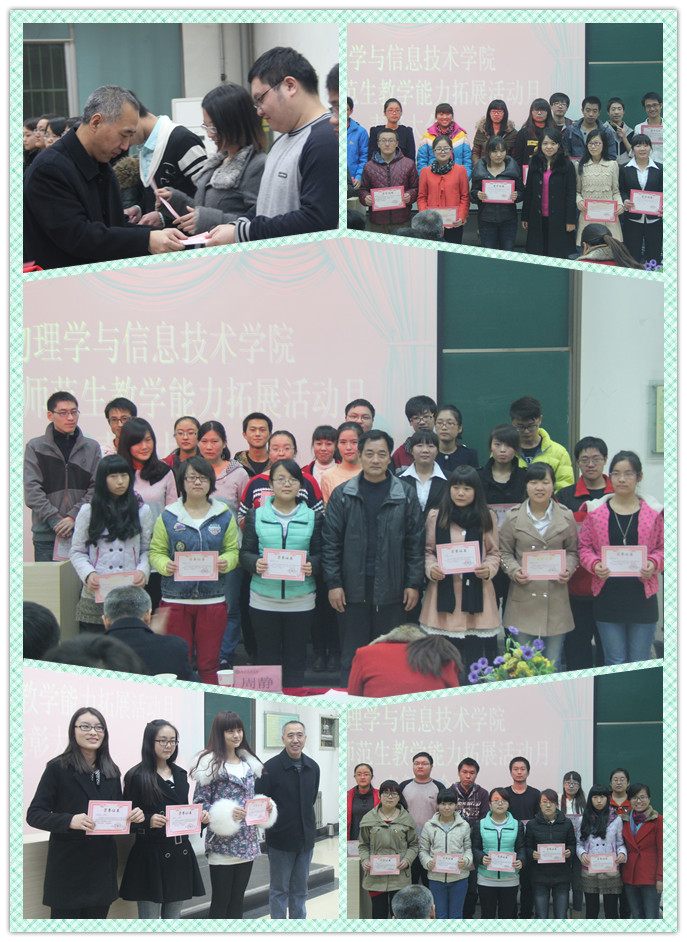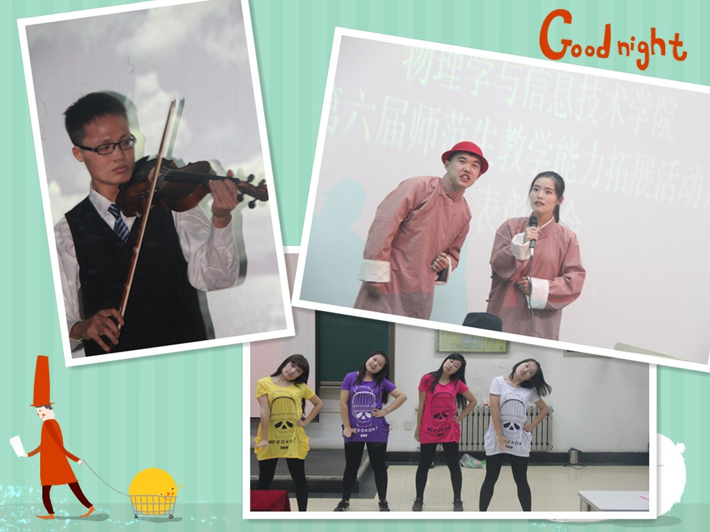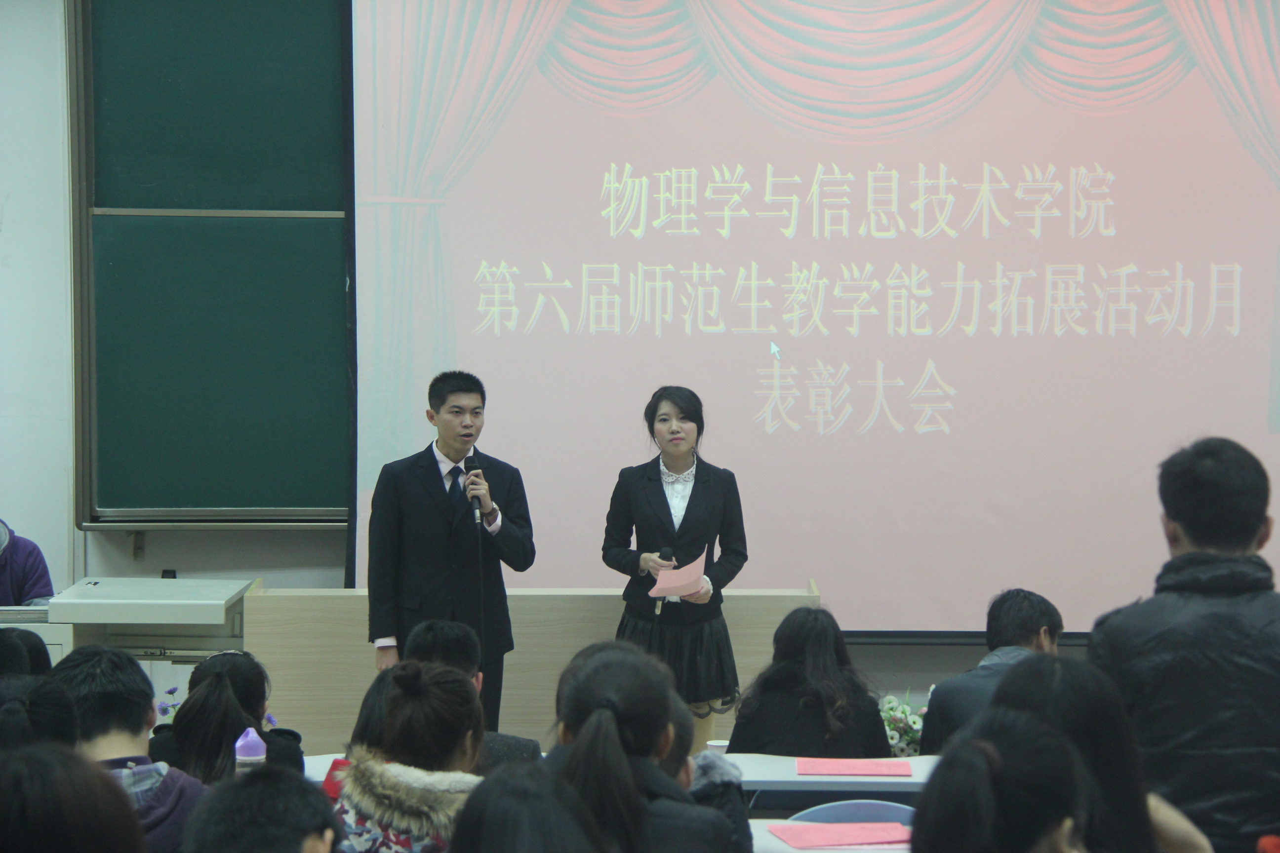 晚会以一段精彩的视频展示开始,大家通过视频回顾了本学期开展的各项学生活动,尤其是同学们在师范生教学能力拓展活动月中的出色表现,全场气氛热烈,同学们兴致高昂。曹宇巍回顾了本学期学院团委学生会策划、组织的主要学生活动,特别是对同学们在刚刚结束的第六届师范生教学能力拓展活动月上的积极表现和优异成绩做出了充分的肯定。她希望同学们在今后的学习生活中一如既往地支持和参与学院各项活动。随后,颁奖环节有序隆重进行。到场老师先后为在“师范生教学能力拓展活动月”、趣味运动会、“宿首”评比大赛中涌现出的优秀个人和集体颁发了奖状。紧接着,获奖学生代表何金蓉作了发言。她表示,学院本学期的各项活动,充分锻炼和提升了广大学生的实践及从教能力,她代表全院学生感谢为活动的顺利开展而辛勤付出的老师和同学。表彰大会环节紧凑,在各颁奖环节间穿插的同学们自编自演的节目也异常精彩。李响等同学带来的劲爆街舞《不要不要》点燃了全场的气氛;肖展望同学完美的小提琴串烧演奏使在场的同学如痴如醉,连连鼓掌;而张淼和她的搭档带来的相声则笑点不断,将全场气氛推向了高潮。