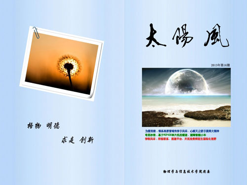 《太阳风》是由我院学生自主创办,旨在提高学院学生文学艺术与理性修养为目标的文理杂志。在学院屈世显院长、曹沛涛书记及其他各位领导的关怀下, 《太阳风》现已出版至第16期。