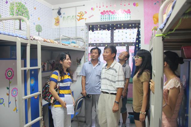 我院领导先后走访了B区唐园和F区兰园学生宿舍,与学生们进行了亲切的交谈,对学生的家庭情况、学习生活等方面进行了深入细致的了解,并希望大家尽早适应新区周围环境,提高安全意识。检查中,绝大部分宿舍干净整齐,物品摆放有序,床铺也收拾得平整洁净,卫生状况良好。还有一些宿舍的学生别出心裁,在墙上贴了海报、地图、书法作品等,在门楣、窗棂和镜框上点缀了精美的饰品,使宿舍显得尤为温馨、舒适、雅观。院领导及各位老师强调,学生宿舍要一直保持这种良好的卫生状态,并杜绝各种安全隐患,共同爱护我们的学习生活环境。