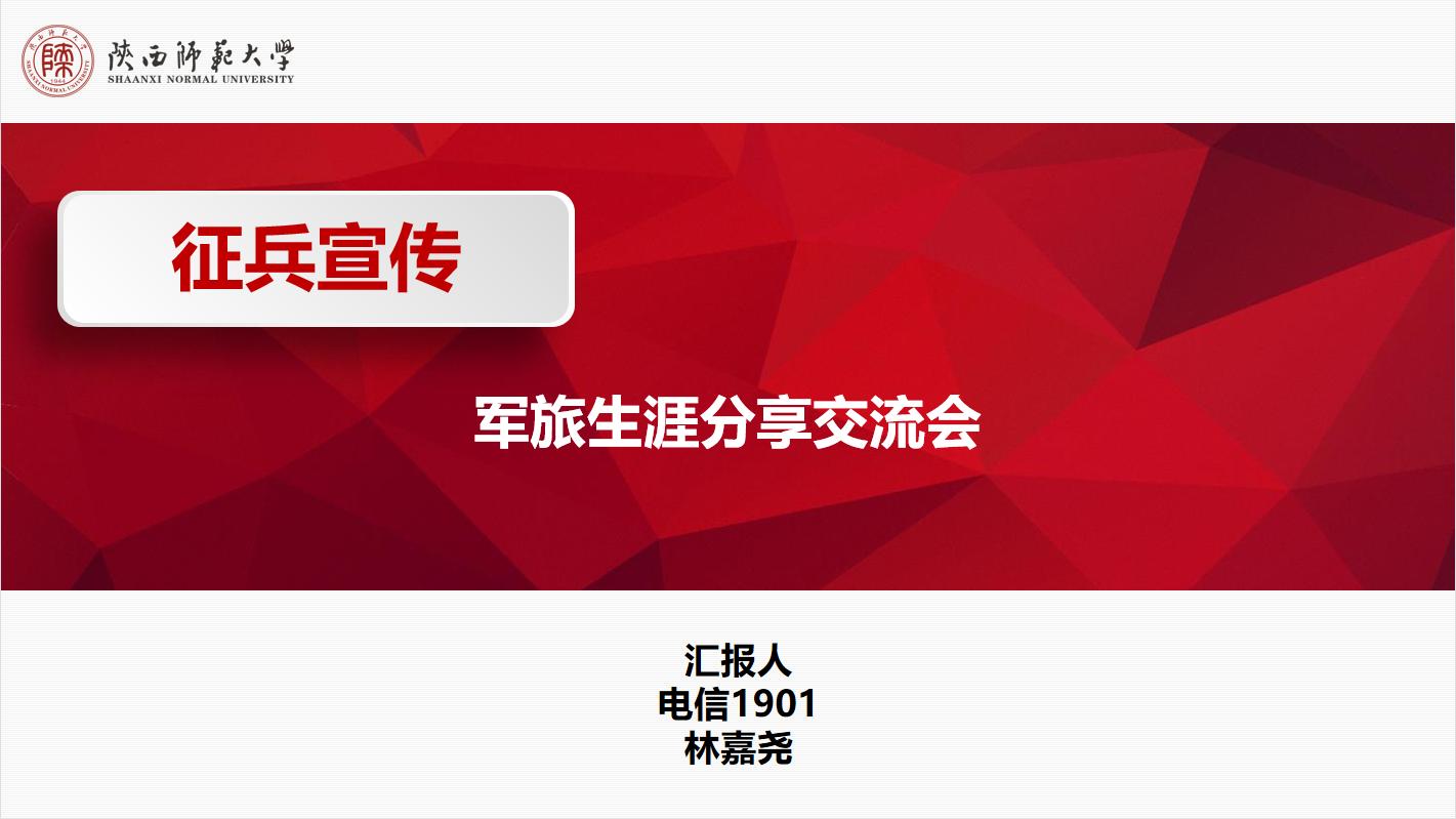席媛媛为大家讲述了她在部队服役的生活及收获:回忆刚开始入伍的艰辛生活,学习叠被子,培养追求完美的习惯,收获不一样的成长,她谈到:青春风华正茂,参军无上光荣。接着林嘉尧从个人履历、日常工作等方面分享了自己的军营生活。他表示自己学会了在压力面前调节自己的情绪,知道了要在青春时期树立理想、勤奋学习、勇于担当,明白要不忘初心。王林巍为同学们分享了军考经历与政策。他谈到:自己两年的军营生活不仅让自己得到了锻炼,也收获了知识和深厚的战友情,“当兵后悔两年,不当兵后悔一辈子”,部队的经历成了他珍贵的记忆。