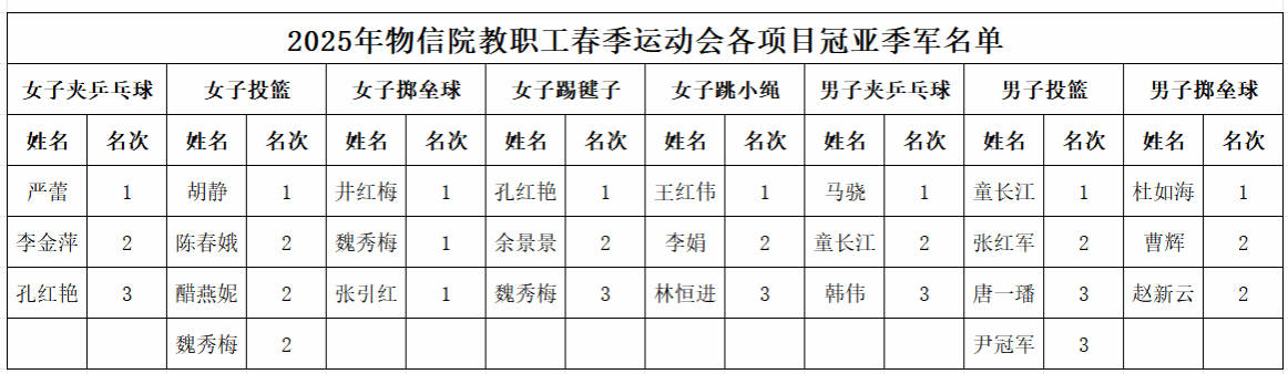 院工会的老师精心为老师们准备了多样活动:踢毽子,跳小绳,投篮,垒球掷准,夹乒乓球等趣味活动。教师们奋进的身影活跃在赛场的每个角落,快乐运动第一,比赛第二,尽情享受着健康运动带来的欢乐。各项运动的获胜老师前三名名单如下: