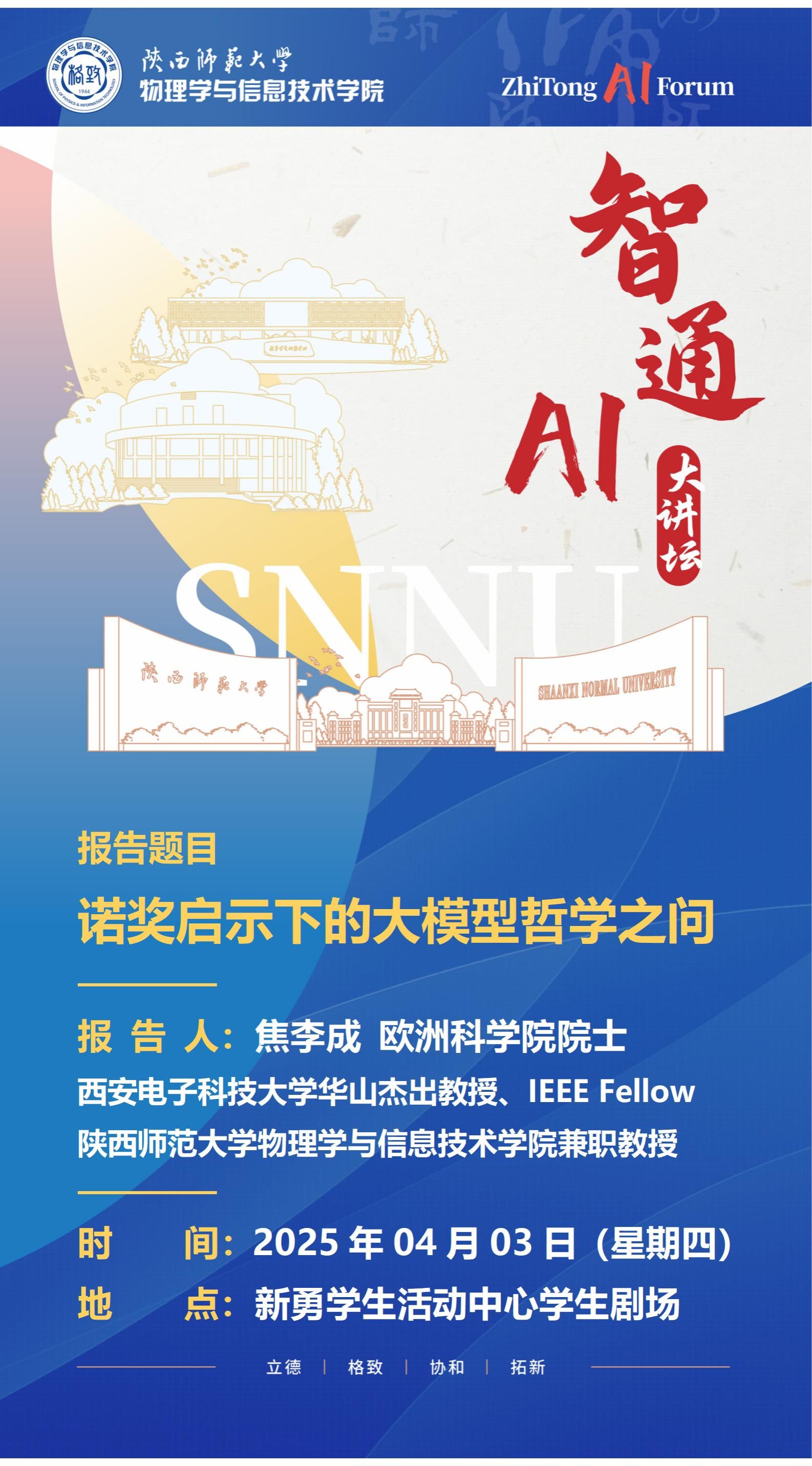 聘任仪式之后,焦李成教授做了题为《诺奖启示下的大模型哲学之问》的报告,回顾了人工智能及大模型的核心技术,介绍了其内涵与发展、以及在发展过程中的变革和存在的挑战。紧接着针对目前的发展现状,给出了从基础理论到应用研究的一些思考和展望。本次报告是公海5500线路检测“智通A I大讲坛”系列学术论坛的第一期。该讲坛主要邀请国内外人工智能领域著名专家学者和行业领军人才担任主讲嘉宾,结合学院物理学、信息与通信工程学科特点,聚焦人工智能与教育教学、科学研究深度融合的创新路径,推动学科交叉融合、教学模式革新与科研范式的数智化升级,推动我院学科建设高质量发展。