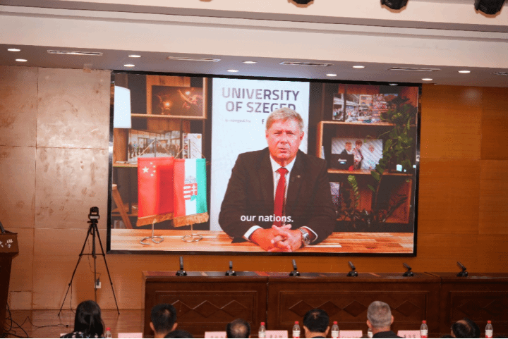 塞格德大学副校长Prof. Dr. Péter Zakar介绍了塞格德大学的悠久历史和文化底蕴。他表示此次合作是 “中匈教育交流的重要里程碑” ,塞格德大学将全力提供优质教育资源,确保 “3+1” 培养模式顺利实施,使学生能够在两种教育体系优势的滋养下成长成才。典礼现场播放了塞格德大学校长Univ.-Prof. Dr. László Rovó特意为本次开学典礼录制的视频致辞,他感谢所有为本项目顺利获批做出杰出贡献的老师们,祝贺并欢迎首批入学的新生,期待同学们开启成功的国际化学习之旅,立志成为信息技术领域的跨学科复合型国际化拔尖创新人才。