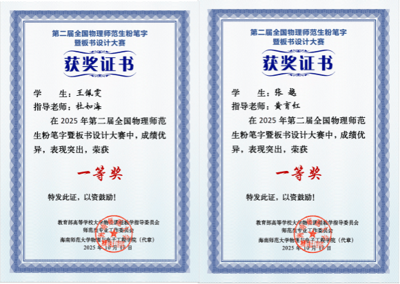 同期举行的“第二届全国物理师范生粉笔字暨板书设计大赛”为师范生提供了展示教学技能的平台。大赛竞争激烈,重点考察选手的粉笔字书写技能、板书的逻辑性与设计美感。经过多轮角逐,学院选派的王佩雯、张越两位同学凭借扎实的书写功底、清晰的布局设计和突出的综合素养,在比赛中表现优异,均荣获一等奖。这一成绩体现了两位同学过硬的个人素质,也彰显了学院在师范生教学基本功训练方面的长期努力与成效。