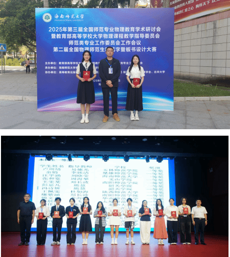2025年10月17日-10月21日,由教育部高等学校大学物理课程教学指导委员会师范类专业工作委员会主办、海南师范大学承办的“2025年第三届全国师范生专业物理教育学术研讨会暨第二届全国物理师范生粉笔字暨板书设计大赛”在海南省海口市顺利召开。学院师生代表应邀参会,与全国同仁深入交流,在学术报告与技能竞赛中表现优秀。