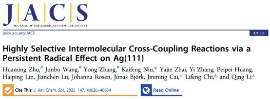 近日,我院李青教授团队以我校为第一且共同通讯单位在顶级期刊Journal of the American Chemical Society上发表题为“Highly Selective Intermolecular Cross-Coupling Reactions via a Persistent Radical Effect on Ag(111)”的研究成果。