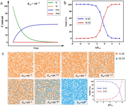 研究团队结合实验观测与密度泛函理论(DFT)计算,系统揭示了分子内自由基逐步迁移的反应路径及其能垒特征,证实了表面上自由基的可控转移过程。在此基础上,研究者进一步通过数值动力学模拟与蒙特卡洛(Monte Carlo)模拟(图二),对“持久自由基效应”的动态本质进行了深入阐释。结果表明,在 Ag(111) 表面,瞬态自由基生成速率(Ktrf)较慢,导致体系中持久自由基的浓度显著高于瞬态自由基,因此导致高选择性的交叉偶联反应。