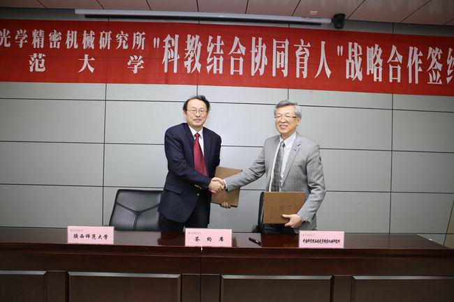 2014年12月30日下午,我校与中国科学院西安光学精密机械研究所“科教结合协同育人”战略合作协议签署仪式在长安校区图书馆一层报告厅举行。中国科学院西安分院院长、西安光学精密机械研究所所长赵卫、研究生部主任李晋芳、综合处处长张岗峰、瞬态光学与光子技术国家重点实验室副主任王屹山和姚保利、刘红军研究员、条纹相机工程中心副主任田进寿,我校校长程光旭、副校长萧正洪、党委常委、学校办公室主任卢胜利及党委宣传部、教务处、研究生院、“211工程”与学科建设处、科学技术处、实验室建设与管理处、发展规划办公室、公海5500线路检测、数学与信息科学学院、化学化工学院、材料科学与工程学院、生命科学学院、计算机科学学院、食品工程与营养科学学院等相关职能部门和学院领导及师生代表150余人出席了签署仪式。会议由萧正洪副校长主持。