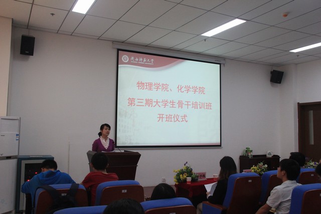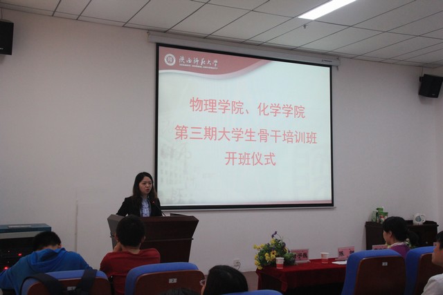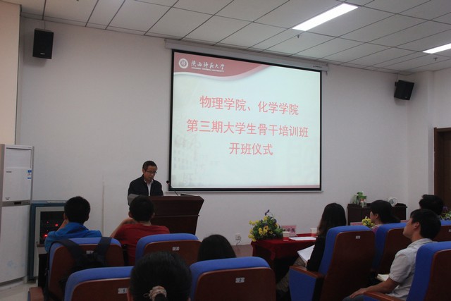 2013年4月26日,物理学院、化工学院第三期大学生骨干培训班开班仪式暨首场讲座在长安校区致知楼六层会议室举行。物理学院党委书记曹沛涛、党委副书记王永革、化工学院团委书记陈钿、物理学院2010级本科生辅导员林雪及两个学院共122名学员参加了会议,会议由物理学院团委书记曹宇巍主持。