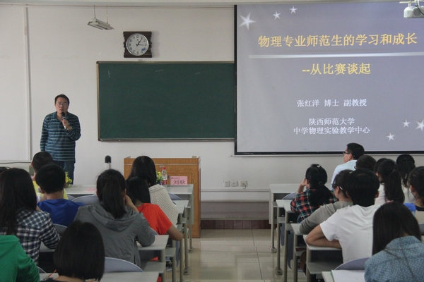 启动仪式结束后,张红洋副教授为同学们做了题为“物理专业师范生的学习与成长”的精彩讲座,他主要从“到底要做什么、能做什么、擅长什么、喜欢什么”等四个方面为同学们阐释了如何能够成为一名优秀的教师,帮助同学们准确地进行自我定位。他通过列举陕师大杰出校友仰孝生和“National Teacher”两个例子,提醒同学们首先要热爱教师这个光荣的职业,并做好充分的心理准备,为成为一名优秀的人民教师而长期奋斗,不懈努力。他指出,学高为师,身正为范,一名教师必须要具备相关的法律知识、专业知识和教育理论才能传道授业解惑,实现人生价值,得到社会认可。他还幽默风趣地通过列举乔布斯等实例强调了作为一名合格的教师需要对自己所做的事情有清晰的定位,并要投入大量的时间和精力。他结合麻省理工教授如何教学的事例,为大家介绍了国家、学校举办的各类教学技能大赛的意义以及参加比赛的益处。讲座最后,张老师热情耐心地回答了同学们关于教师职业、教学技能提升等方面的疑问和困惑。