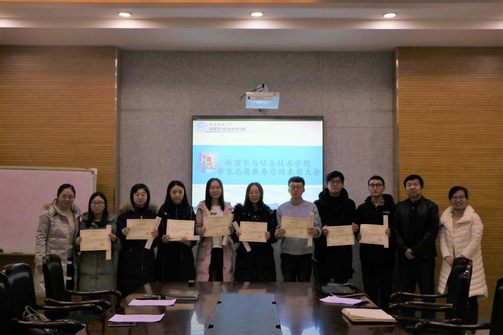 曹宇巍介绍了本年度研究生志愿服务的基本情况,重点回顾了由我院承办的西北地区师范院校物理类专业教育教学改革研讨会中研究生志愿者的主要工作。她充分肯定了研究生志愿者的辛勤付出,也对两天会议的整体志愿服务工作进行了总结。杨仁财宣读了年度优秀志愿者名单。优秀志愿者代表莫秋实从后勤组志愿者的工作内容出发,与大家分享了自己两天志愿服务的感受与收获。随后学院领导为优秀志愿者颁发了荣誉证书和纪念品。
