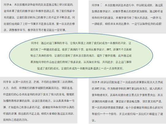 教师认真指导:各位指导教师在接到学院工作安排后,积极组织各小组的学生,借助各种网络工具有计划的开展线上指导,从选题、导入技能和授课技能、教学设计、PPT制作、微课录制等方面引导学生逐项练习。对于在线指导面临的学生实验设备有限、讲课条件受限等问题,教师和学生共同努力克服;针对每个学生的讲授,指导教师除了在线点评外,也做好了详细记录。
