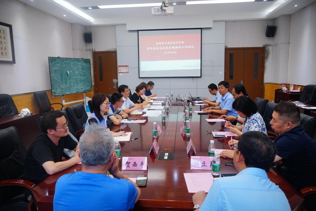 为扎实推进学校“十四五”学科建设开局工作,科学谋划学科发展思路和举措,全面提升学科建设水平,2021年7月2日下午,校学科建设与发展规划处(“双一流”建设办公室)处长周正朝,科长王秀铭、魏茜、林雪和科员宋月莹一行五人来我院调研学科建设工作,在致知楼3328会议室进行了学科建设专题调研座谈会。校党委常委、院长李贵安,党委书记辛向仁、科研副院长张林、各学科负责人及教授代表参加了会议。会议由院长李贵安主持。