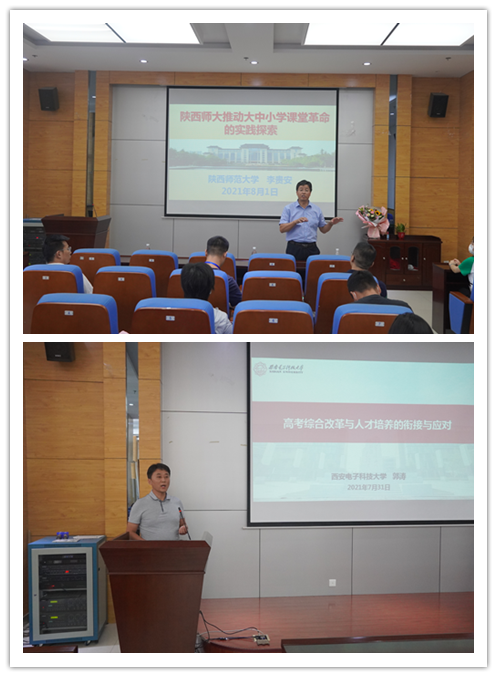 研讨会相关学者专家围绕基础教育改革、深化课堂教学改革创新、依托信息化技术开展个性化的教育教学、课程思政、高考综合改革等方面做报告。西安电子科技大学教务处副处长兼招生办公室主任郭涛研究员作主题报告《浅谈我国高考制度改革与发展——高考综合改革实践与思考》;公海贵宾会5500iii党委常委、公海5500线路检测院长李贵安教授作主题报告《陕西师大推动大中小学课堂革命的实践探索》;公海贵宾会5500iii博士生导师衣新发教授作主题报告《课堂创新·化育英才》;西安市灞桥区东城第一小学校长吴金华作主题报告《让生命在课堂上绽放光彩》;西安市庆安初级中学校长李冰作主题报告《因为热爱·所以执着》。