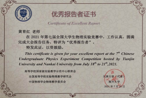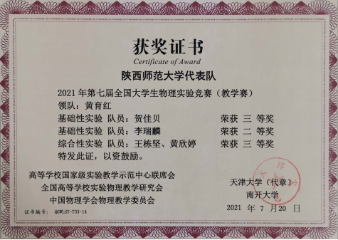 根据教育部高教司(高教司函[2010]13号)文件及全国大学生物理实验竞赛章程,由高等学校国家级实验教学示范中心联席会、全国高校实验物理教学研究会、中国物理学会主办,南开大学、天津大学和天津市物理学会共同承办的第七届全国大学生物理实验竞赛(Chinese Undergraduate Physics Experiment Competition,简称CUPEC)(教学赛)于2021年7月18日至7月21日在南开大学八里台校区和天津大学卫津路校区举行,来自全国一百多所高校的本科生展开激烈角逐。该项赛事是教育部认定的全国普通高校大学生竞赛排行榜中的学科竞赛之一,也是我国物理实验学科面向本科生进行的最高级别比赛之一。此次竞赛分为基础物理和综合类实验比赛两种类型。在我院教师李永放教授、王成会教授、黄育红副教授、王恒通副教授和基础实验中心刘志存副教授的指导和培训下,我院选拔出4名优秀本科生参加此次竞赛并取得了优异的成绩,获得国家级二等奖1项,三等奖2项。