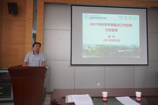 行政副院长郭伟总结了学院上半年在师资队伍、资产管理和民生工程中取得的成绩,详细通报了学院在拓展办学空间上的各项举措。围绕师资队伍建设、资产流转中心建设、落实教育评价改革、环境改造等方面安排下半年重点工作,对学院高层次人才工作、办公区域调整、办公室人员工作分工等作出说明。