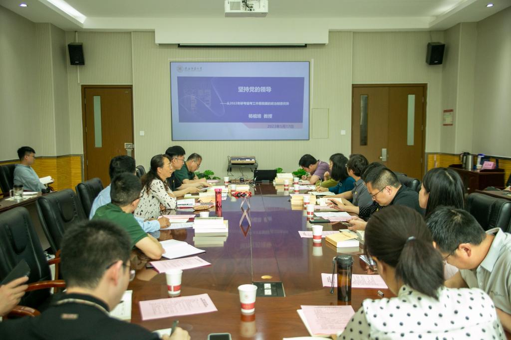 活动中,杨祖培副校长结合自身学习、体会以及感悟,讲授了题为《坚持党的领导——从2022年研考组考工作看我国的政治制度优势》的党课。杨校长从深刻把握党的二十大关于人才强国战略和研究生培养的重要性出发,讲述了2022年学校应对突发疫情挑战圆满完成“应考尽考”和“平安考研”目标的艰辛过程,分享了全校师生众志成城、共克时艰的感人事迹。杨校长指出,2022年研考组考过程充分彰显了我国的领导力量、思想力量、国家力量、人民力量、道德力量,充分展现了中国特色社会主义制度的优越性。杨校长勉励大家,要不断坚定“四个自信”,修身立德、求实创新,做支撑科技自立自强的中坚力量,做助力民族复兴大业的时代精英。教工第四党支部,研究生第六、第七党支部党员代表结合学习做交流发言,表达了用奋斗拼搏践行使命担当的决心。