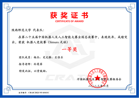 学院高度重视本项赛事,在赛前为选手们进行动员,鼓舞士气。本届大赛中,两支参赛队伍均以陕西赛区二等奖进入全国初赛。省赛结束后,他们更加积极备战,全力应对全国比赛。总决赛中,两支队伍愈赛愈勇,成功从众多高校队伍中脱颖而出,荣获全国一等奖。其中,“SNNU-ALPHA”队更是击败了上届比赛的冠军,取得了陕西省最优名次、全国季军的好成绩。两支队伍的优秀成绩,离不开老师们的指导与训练,也展现了我院学子的全面发展与编程能力,将兴趣与学业将结合,成功的将足球的经验转化为比赛的策略,既能踢好足球,又能打好比赛。
