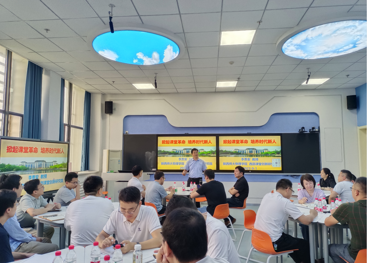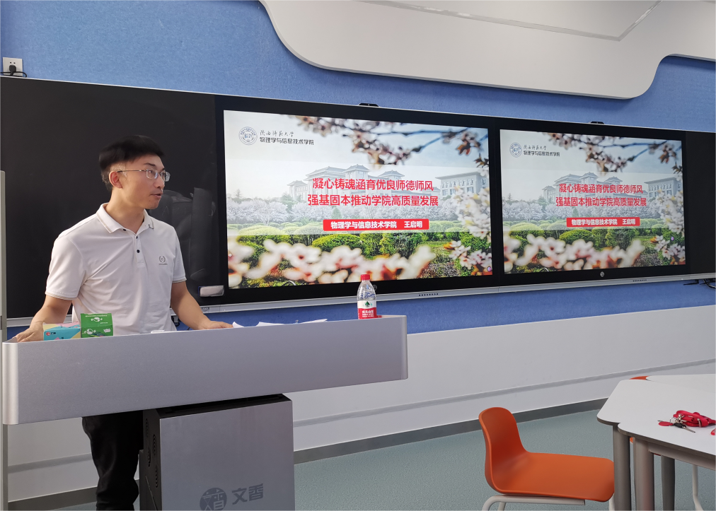 学校党委常委、物理学院院长李贵安教授做了题为《掀起课堂革命 培养时代新人》的主题报告。学院党委书记王启明做了题为《凝心铸魂涵育优良师德师风 强基固本推动学院高质量发展》的主旨报告。李贵安教授从课堂教学革命的理念到具体实践操作经验为参会教师做了详细的分享,并在报告后与参会教师的现场进行了互动交流。王启明书记强调了教师师德师风的“高线”、“底线”和“红线”,鼓励青年教师发挥自身优势,推动学院高质量发展。