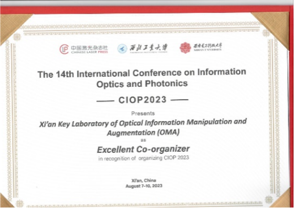 我校(西安市光信息调控与增强技术重点实验室)荣获CIOP2023会议优秀组织者奖。