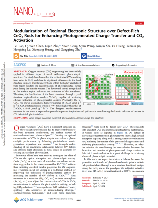 近日,我院朱刚强教授团队在国际权威学术期刊《纳米·快报》(Nano Letters)上发表题为“Modularization of Regional Electronic Structure over Defect-Rich CeO2 Rods for Enhancing Photogenerated Charge Transfer and CO2 Activation”的研究成果。该研究开创性地揭示了晶体缺陷空间调控及其电子能带结构局域化的物理机制,并成功利用此机制在CeO2纳米材料中实现了光催化区域功能模块化,实现了高缺陷CeO2材料光生载流子产生和分离(转移)之间的平衡,为设计和开发高效光量子转化新材料提供了新的研究思路和重要的理论基础。该论文于2024年4月1日被《Nano Letters》接收,并于2024年4月18日正式发表。我校为唯一通讯单位,我院博士研究生饶斐为第一作者。我院朱刚强教授,朱陆军副教授为共同通讯作者。该成果获得中央高校基础研究基金和国家自然科学基金等项目的支持和帮助。
