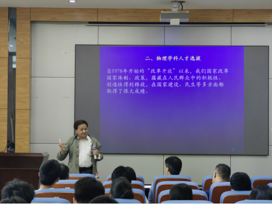4月21日下午,北京大学物理学院陈晓林教授受邀做客我院“八秩芳华·恒元物理学讲座”,在物理学院六层报告厅为我院师生做了题为“物理竞赛与人才选拔、培养”的专题报告。校党委常委、学院院长李贵安、学科教学论教师、学院负责学生竞赛教师、大学物理课程教师以及学院2021级公费师范生参加了报告会。报告会由院长李贵安主持。