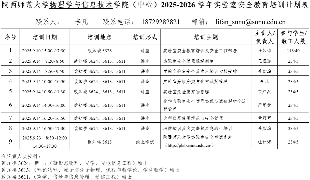 2. 实验室负责人和学生安全员安全工作会议:9月10日 15:00~17:30,致知楼3328