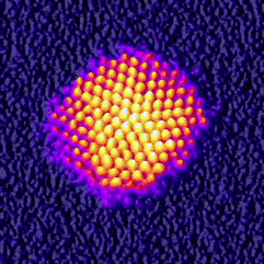 the atomic structure of size-selected “magic number” gold clusters – Au20, Au55, Au309, Au561, and Au923 – including dynamical manipulation experiments [6], which probe the transformation of metastable isomers into more stable configurations, and reaction-exposure experiments, which probe the stability of the nanocluster structures under real catalytic conditions. The results distinguish the hierarchy of competing isomers as a function of cluster size, expose concepts such as templated-growth, provide a body of data to stimulate and constrain computational models and are readily extendable to other sizes and cluster materials including binary systems. The image shows one frame from a dynamical STEM video of an Au923±23 cluster.