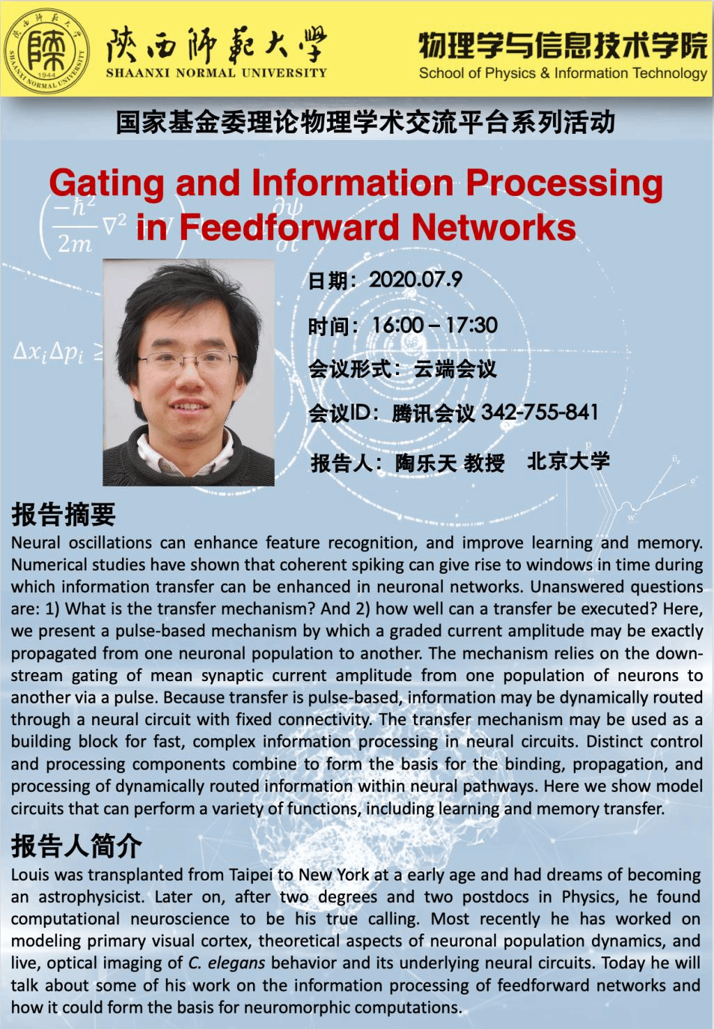 国家基金委理论物理学术交流平台系列活动:Gating and Information Processing in Feedforward Networks