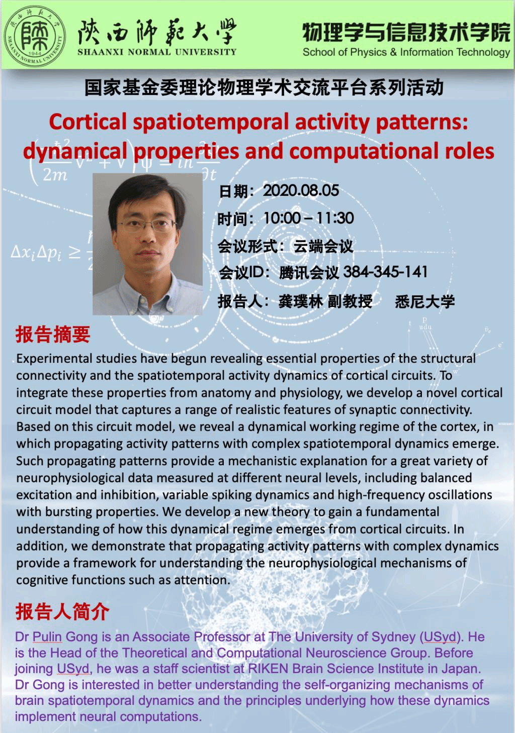 国家基金委理论物理学术交流平台系列活动:Cortical spatiotemporal activity patterns:dynamical properties and computational roles