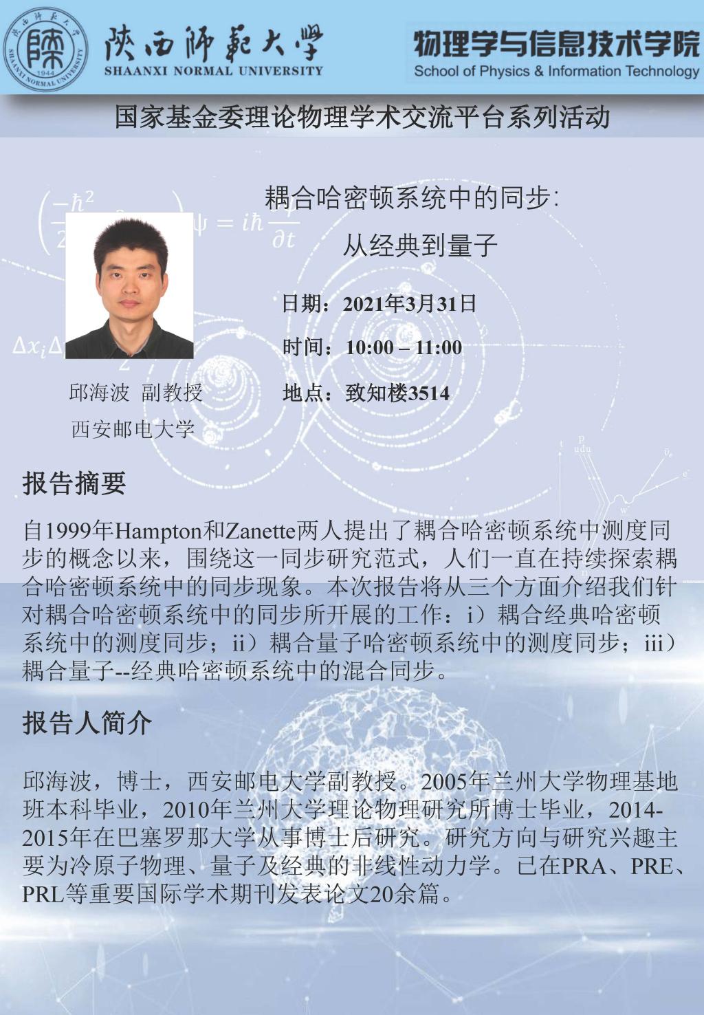 国家基金委理论物理学术交流平台系列活动:耦合哈密顿系统中的同步:从经典到量子