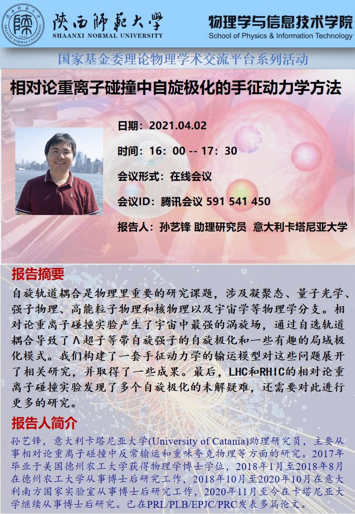 国家基金委理论物理学术交流平台系列活动:相对论重离子碰撞中自旋极化的手征动力学方法