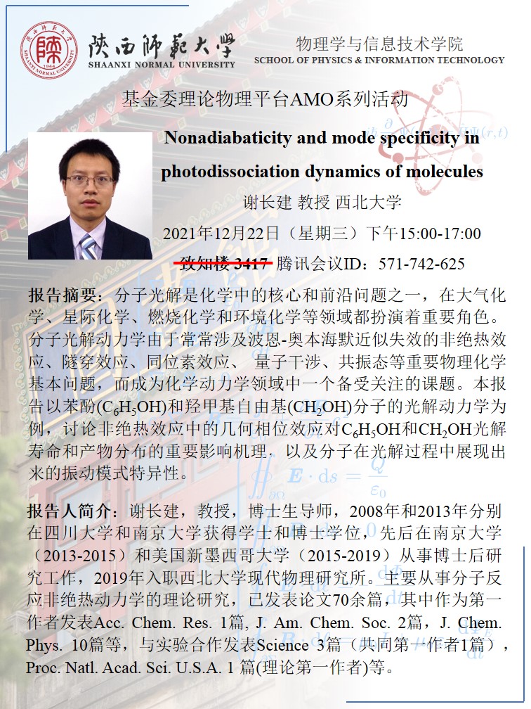 基金委理论物理平台AMO系列活动:Nonadiabaticity and mode specificity in photodissociation dynamics of molecu