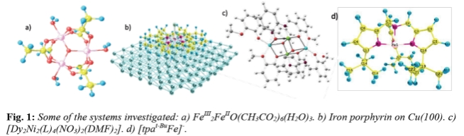 First, we investigate the time-dependent photoinduced dynamics in a Fe3 molecule (Fig. 1a) [1], revealing spin-flipping channels. Second, we analyze substrate effects, by exemplarily investigating the adsorption of iron porphyrin on Cu (100) (Fig. 1b) using second-harmonic generation. Third, we look into the magnetic properties of two magnetic polymers of Cu(II) complexes, the magnetic behavior of which can be controlled through different stackings [2]. Fourth, we study the ultrafast dynamics of [Dy2Ni2(L)4(NO3)2(DMF)2] (Fig. 1c) as well as trigonal monopyramidal Fe and Ni complexes (Fig. 1d) [3]. By comparing theory with experiment, we unveil the (partial) metal-to-oxygen charge transfer and estimate the thermal system-to-bath coupling constant [4]. Finally as concrete examples of possible realization of quantum logic we present a charge-spin gear box on the synthesized magnetic nanostructure Co3Ni(EtOH) [5], and the implementations of the Controlled-NOT, Hadamard, SWAP, and Pauli gates states in [Dy2Ni2(L)4(NO3)2(DMF)2] [6] and Co-decorated graphene nanoflakes [7]