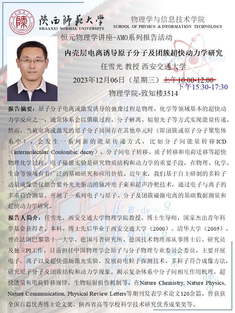 恒元物理学讲座-AMO系列报告活动:内壳层电离诱导原子分子及团簇超快动力学研究